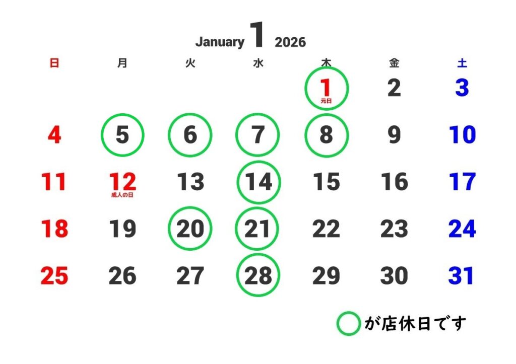 1月の店休日カレンダー