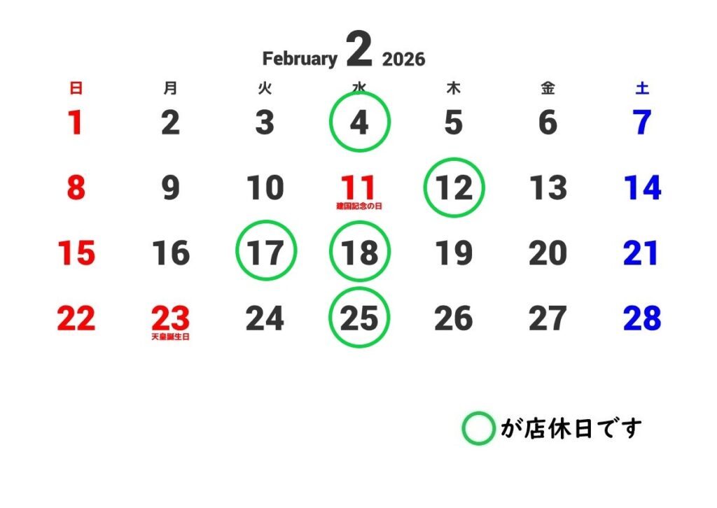 2月の店休日カレンダー